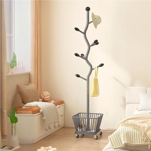 MIDUOLAI Portant à VêTements en MéTal à roulettes, Portant-Manteau Roulant Autoportant, pour éCharpes, Vestes, Chapeaux Et Sacs, Portant à VêTements avec Panier, pour EntréE,C,05