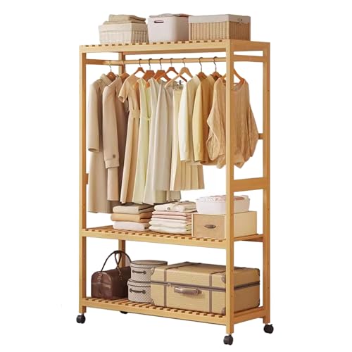 Portant à vêtements en bambou, armoire ouverte avec roulettes, portant à vêtements avec 3 étagères de rangement et une tringle supérieure pour suspendre les vêtements, la chambre à coucher,