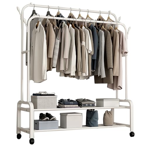 Portant À Vêtements Solide Portant Vetement Avec Roues, Portant Double Porte-vêtements Suspendre En Métal Avec Étagère À Chaussures, Portable Mobile Porte-manteau Sur Pied, 105×140cm ( Color : Wit , S