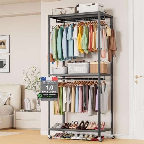 AQRA Portant à Vêtements Solide, Dimensions: 90 × 40 × 200 Centimètres,200kg, Penderie Sur Roulette, Kleiderschrank Metall Avec 2 Tringles, 3 Etagères de Rangement et 2 Crochets, Noir
