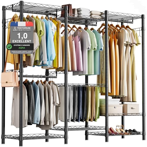 AQRA portant a vetement,penderie sur roulette à Haute Résistance avec 3 Étagères Réglables, Penderie Métal Ouverte avec 3 Tiges et Crochets Latéraux, Poids Maximum 400 kg, 172 * 38 * 194 cm, Noir