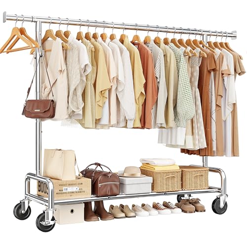 Klyvvo Portant a Vetement Solide à Roulettes, Penderie Extensible pour Charge Lourde, Capacité de Charge 150 kg, portant vêtements roulettes et étagère porte, pour présentation, rangement, Chromé