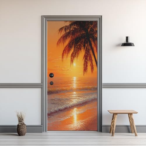 Sticker Porte Tropical Océan Plage, Sticker Mural Porte 63 x 205 cm Coucher de Soleil, pour Salon Chambre Décoration De La Maison Muraux Imperméable Stickers Amovibles SR14zh141A