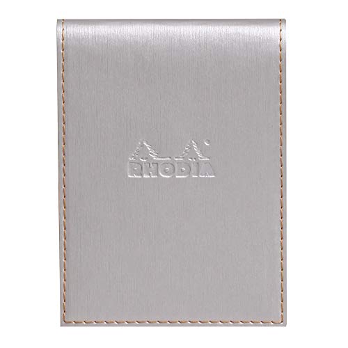 RHODIA 128201C - Étui Porte-Bloc+ Bloc-Notes Agrafé N°12 Argent - 8,5 x 12 cm - Ligné - 80 Feuilles Détachables - Papier Clairefontaine Blanc 80 g/m² - Porte-Crayon - Simili Cuir - Collection rama