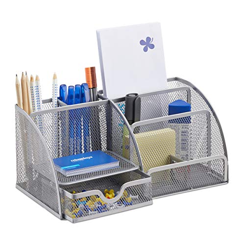 Relaxdays 10022480_55 Organiseur de Bureau stylos Lettres Porte Bloc-Notes Maille métal 5 Compartiments, Argent, Silber, 10,5 x 25,5 x 18 cm