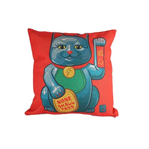 lachineuse - Housse de Coussin Maneki Neko - Motif Porte-Bonheur Japonais - 44 x 44 cm - Coton & Lin - Orangé, Bleu Gris - Ambiance Zen - Déco d'Asie - Maison, Bureau - Idée Cadeau Chine, Asie