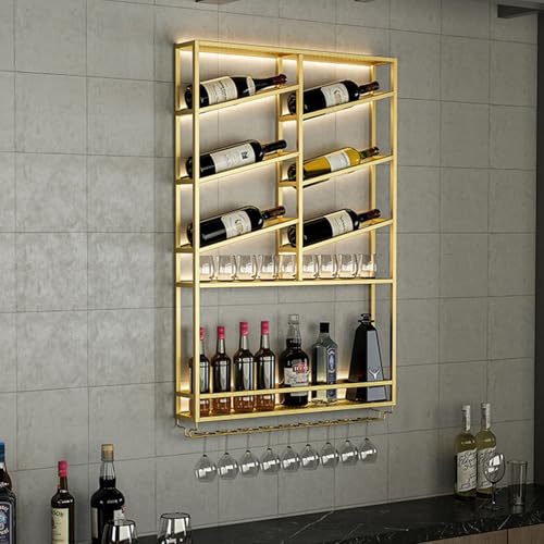 Porte-bouteilles mural avec LED, support de rangement pour vin avec porte-verres, pour stocker des bouteilles de vin dans un style industriel, idéal pour la cuisine, le bar ou la salle à manger.(Gold,