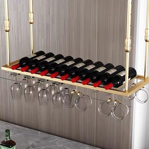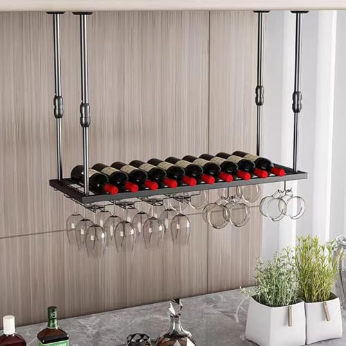 FBITE Meuble de Bar Suspendu au Plafond Porte-Bouteilles de Vin Mural au Plafond, Porte-Verre à Vin à Hauteur Réglable à Suspendre Art en Fer pour Bars Cuisines Décoration Étagère de Rangement, No