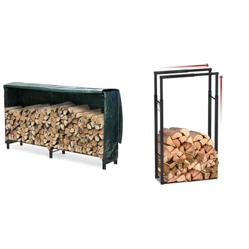 vounot Porte Bûches Télescopique Étagère à Bois de cheminée Ajustable avec 4 Crochets Stockage à Bois de Chauffage 100x65x25cm & Serre Bûche 2m avec Housse de Protection Range Bûche Acier Serre Bûche