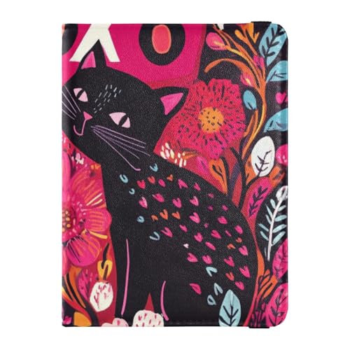 Porte-passeport personnalisable en cuir noir avec motif de chats pour la Saint-Valentin, organiseur de documents de voyage, porte-badge, carte de vaccin, portefeuille léger, Fleurs de Saint-Valentin