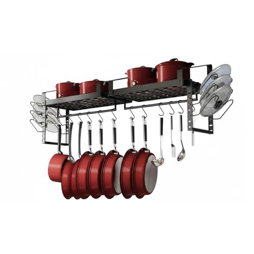 Wintem – Porte-casseroles couvercles gain de place mural avec étagères et 12 crochets, organisateur de cuisine en fer pour casseroles couvercles et louches, système vertical robuste et fonctionnel