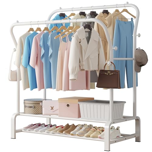 SMILOVII Portant à Vêtements Robuste en Métal, Double Tringle avec 4 Crochets Latéraux, 2 Étagères à Chaussures, Porte-Vêtements Multifonction pour Chambre, Bureau, Intérieur - Blanc