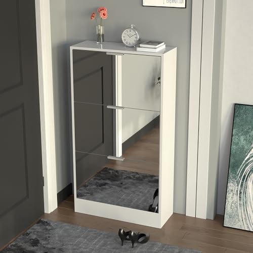 BAKAJI Meuble à chaussures avec portes miroir rabattables, porte-chaussures avec étagères à rabats et poignées, structure peu encombrante, design moderne, idéal pour salon, entrée, salon, bureau (3