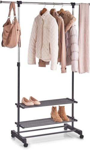 Avilia Support porte-manteau de chambre réglable avec étagères pour chaussures - Porte-chaussures et porte-chaussures en métal gris et noir avec roulettes, 80-120x42.5x101.5-166 cm