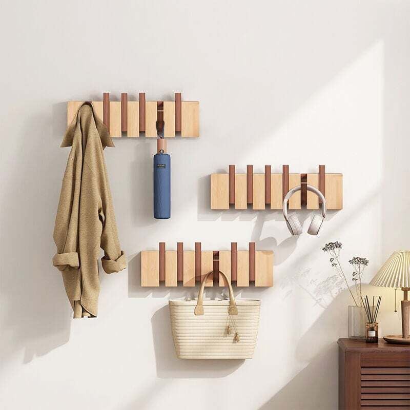 Patère Murale de 6 crochets rétractables, , Porte Manteau Mural, Cintre D'angle en Bois Massif pour Suspendre Manteaux écharpes, Sacs à Main et