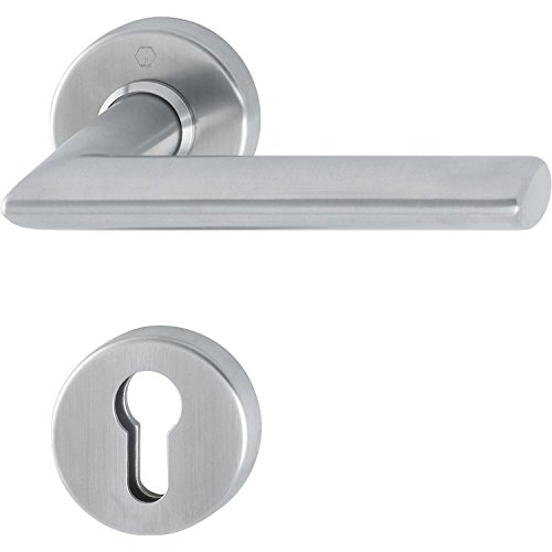 Hoppe Poignée de porte Porte d'entrée à moitié de Stockholm, acier inoxydable mat, Clé Rosace Convient à bouton longue Plaque de porte Stockholm, épaisseur 67–72 mm, tige carrée 8 mm, rundrosette PZ, sécurité virole