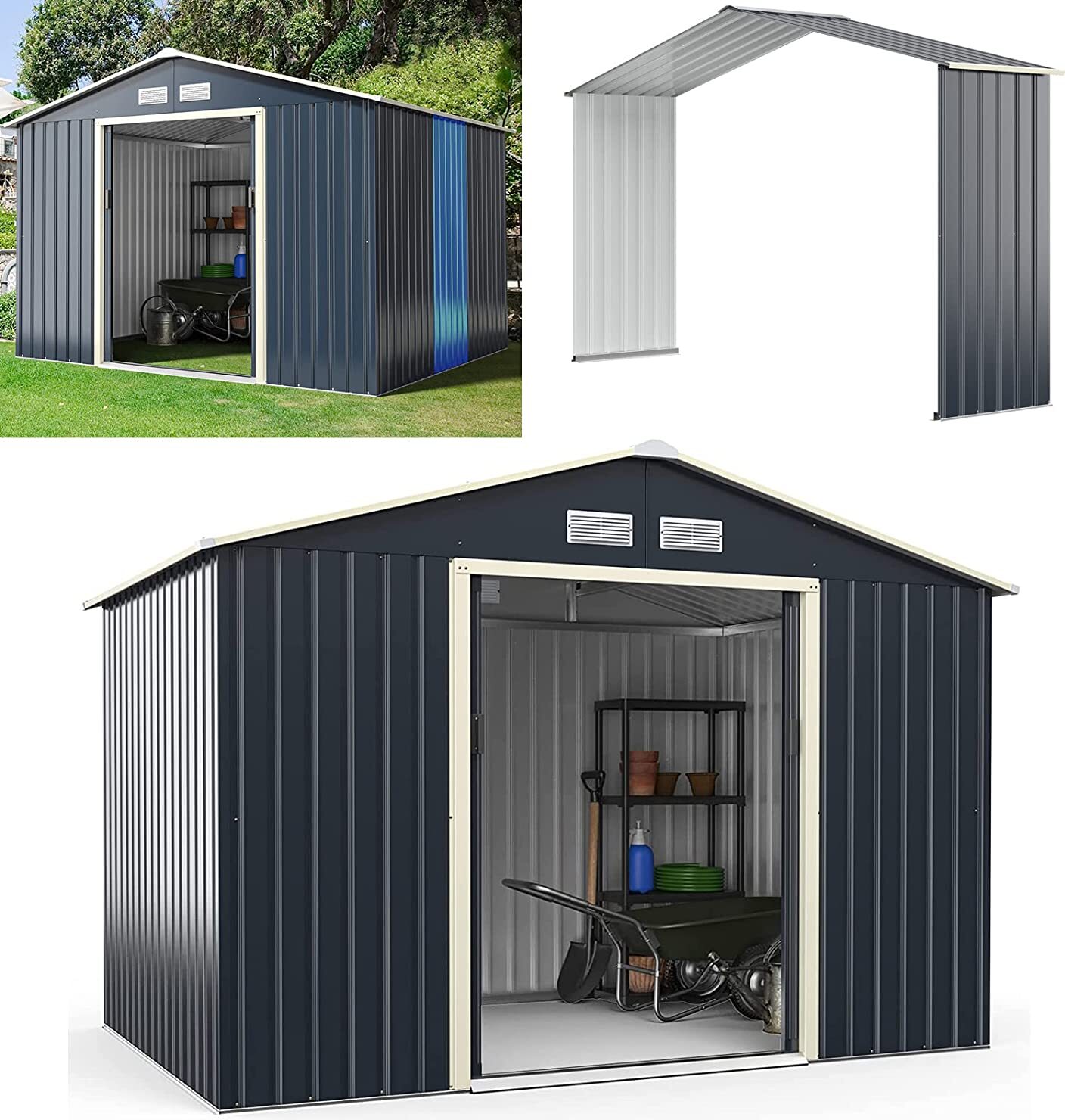 Abri de Jardin métallique Anthracite 257 x 298 x 178 cm, abri à Outils avec Double Porte coulissante et Ventilation, abri de Jardin métallique avec Plancher pour Outils de Jardin.