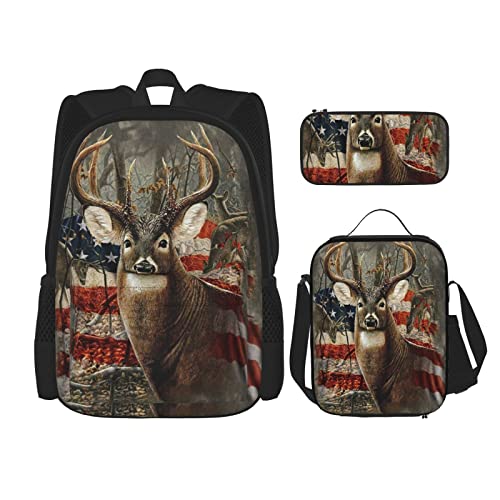 3 pièces ensemble sacs à dos cerf drapeau américain chasse bois camo rustique patriotique vieille forêt rétro livre sac voyage travail école sac porte-crayon sac à lunch combinaison pour hommes femm