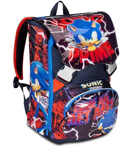 Seven Sonic Prime Sac à dos d'écolier extensible avec double fermeture éclair et porte-bouteille pour enfant Bleu
