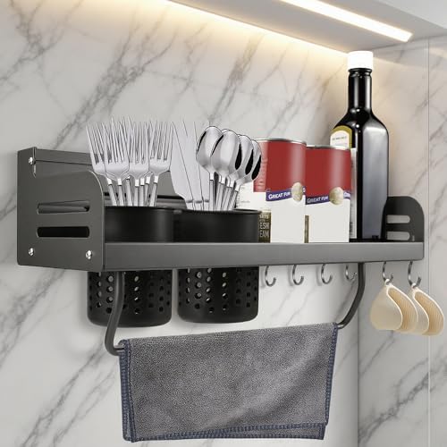 WEFHEF Étagère à Épices Murale avec Porte-Serviette, Porte-couverts, Fente pour Couteau et Crochet de Rangement, Organisateur Épices 40 cm, Range Épice Suspendue Métal, pour Bocal Ustensiles Cuisine