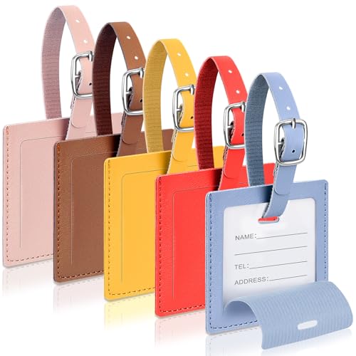 Cozary 5 Pièces Etiquette Valise en PU, Carré Étiquette Bagage avec Boucle Réglable, Porte Etiquette Valise Inscriptible Nom Adresse, Luggage Tag pour Sac de Voyage Valise Sacs à Dos