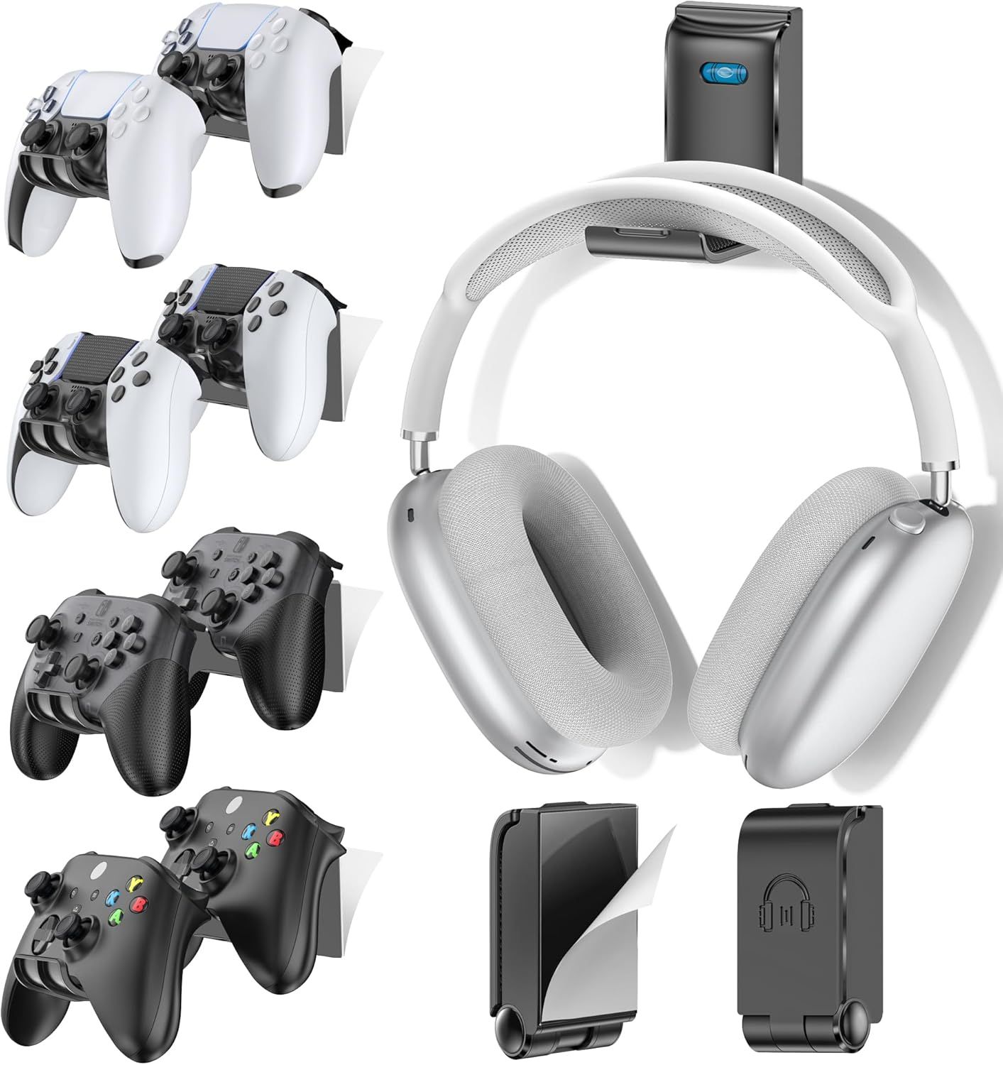 Support de Manette et Casque, Support Universel Murale pour Manettes Xbox/PS5/PS4/Nintendo Switch, Organisateur de 8 Accessoires Gaming avec Porte-Casque Pliable, Noir, 4 Paquets