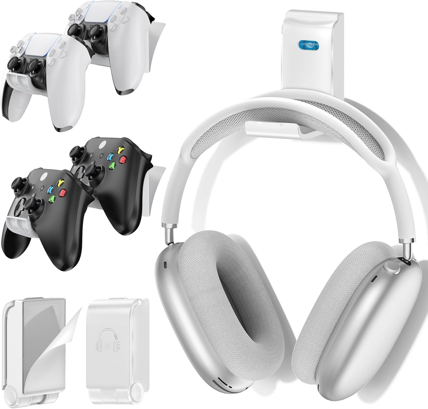 Support de Manette et Casque, Support Universel Murale pour Manettes Xbox/PS5/PS4/Nintendo Switch, Organisateur de 4 Accessoires Gaming avec Porte-Casque PliableBlanc, 2 Paquets