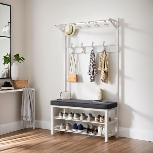 FGXHHS Porte-Manteau et Banc à Chaussures 4 en 1 en métal avec étagère de Rangement, Crochets, Coussin Moelleux et Barre de Suspension. Organisateur élégant pour Salon, Couloir ou Chambre