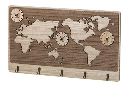 DRW Porte-manteau avec horloge carte du monde avec 3 horloges en bois 60 x 3,80 x 35 cm