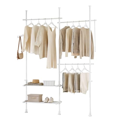 SoBuy 30% de Réduction Télescopique Porte-vêtements Système de Penderie Télescopique Porte-Manteau Réglable, 1 Barre, 3 Etagères et 1 Vêtement Fork, L97 x H(193-262) cm, Blanc, KLS15-WN