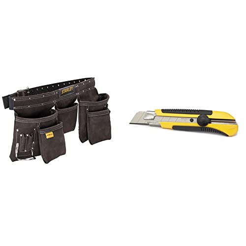 STANLEY Porte Outils Double Ceinture - Nombreuses Poches - Cuir de Qualité Supérieure - Dimensions 145 x 9 x 26 cm STST1-80113 & 0-10-425 Cutter 25 mm Bi-matière Dynagrip - Blocage de La Lame