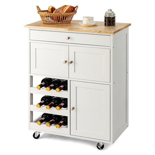 KOMFOTTEU Îlot Central avec Rangement et Plan de Travail en Bois d'hévéa, Chariot à Roulette avec Tiroir, 2 Armoires, Porte-Bouteilles à 3 Niveaux, Desserte à roulettes, 67 x 37 x 86 CM (Blanc)