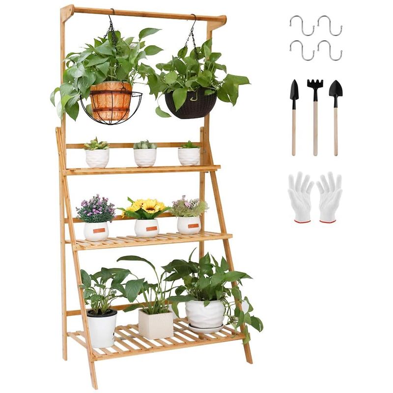 Tagère Échelle Plantes en Bambou 3 Etage - 70x40x96cm Porte Plante Étagère à Feurs Intérieur ou Extérieur avec Tige pour Pot de Fleur Suspendu,
