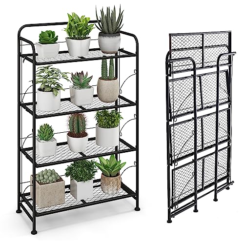 GOPLUS Support Plantes Interieur à 4 Niveaux en Métal à Lattes, 60 x 25 x 100 CM, Porte Plante Interieur Pliante avec Tablettes Réglables & Pieds Réglables, Idéal pour Balcon, Jardin, Terrasse, Noir