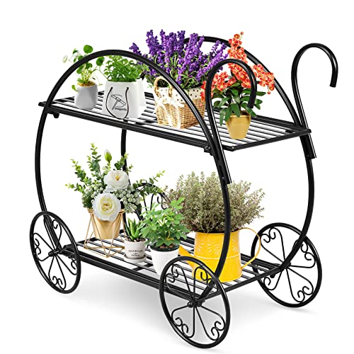 RELAX4LIFE Porte-plantes Interieur à 2 Niveaux, Étagère Plante en Fer Forgé 60x35x66cm, Support Plantes en Forme de Chariot avec Roulettes Décoratives, Style Rétro pourMaison Serre Patio, Noir