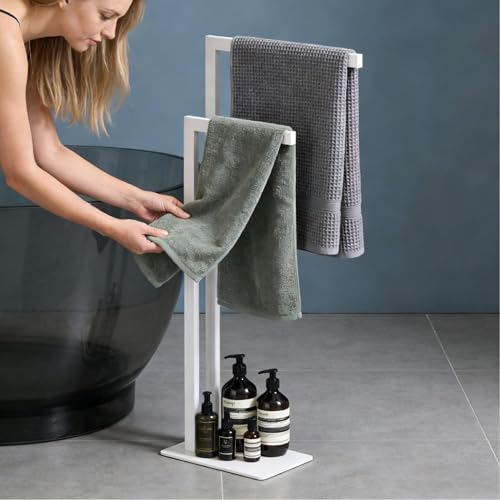 Porte-Serviettes de Salle de Bain sur Pied, Porte-Serviettes Autonome avec 2 Barres, Stabilité Porte Serviette sans percage pour Salle de Bain, Cuisine, Essuie-Mains (White, 65×20×110cm)