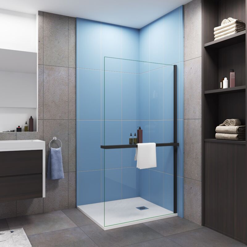 Paroi de douche à l'italienne profilé en noir 80x200cm avec étagère de douche et porte serviette profilé en noir mat