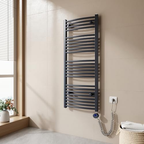 EMKE Sèche-Serviette électrique pour Salle de Bain 120 x 50 cm, Radiateur courbé avec WiFi Thermostat, Chauffe-Serviettes électrique,Support Porte-Serviettes électrique, Anthracite,500 Watts