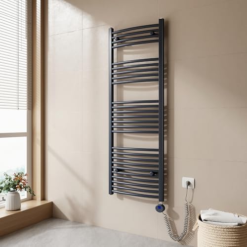 EMKE Sèche-Serviette électrique pour Salle de Bain 140 x 50 cm, Radiateur courbé avec WiFi Thermostat, Chauffe-Serviettes électrique,Support Porte-Serviettes électrique, Anthracite,600 Watts