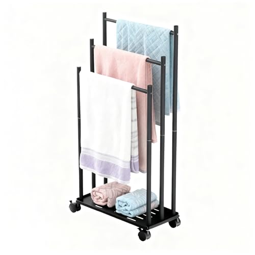 Porte Serviette Salle de Bain sur Pied 4 Barres, Support Seche Serviette Noir, Porte Serviette avec Tablette Métal Rangement Serviette Organisateur pour Cuisine Buanderie Salon Côté Piscine (Black)