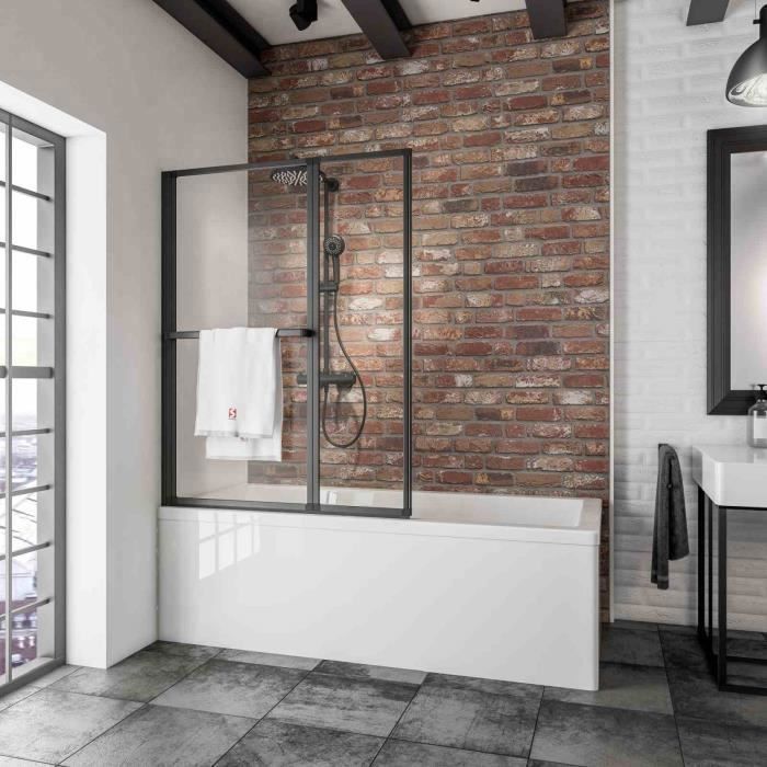 Schulte pare-baignoire 109x140 cm à coller sans percer porte-serviette volets pivotants pliants verre 3 mm transparent noir