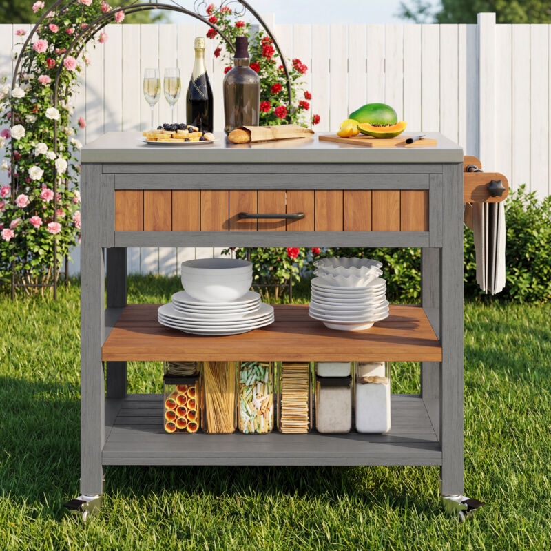 Armoire de jardin mobile sur roulettes 80x51x91,5 cm - station barbecue avec plan de travail inox, tiroir, étagères et porte-serviette, bois massif,