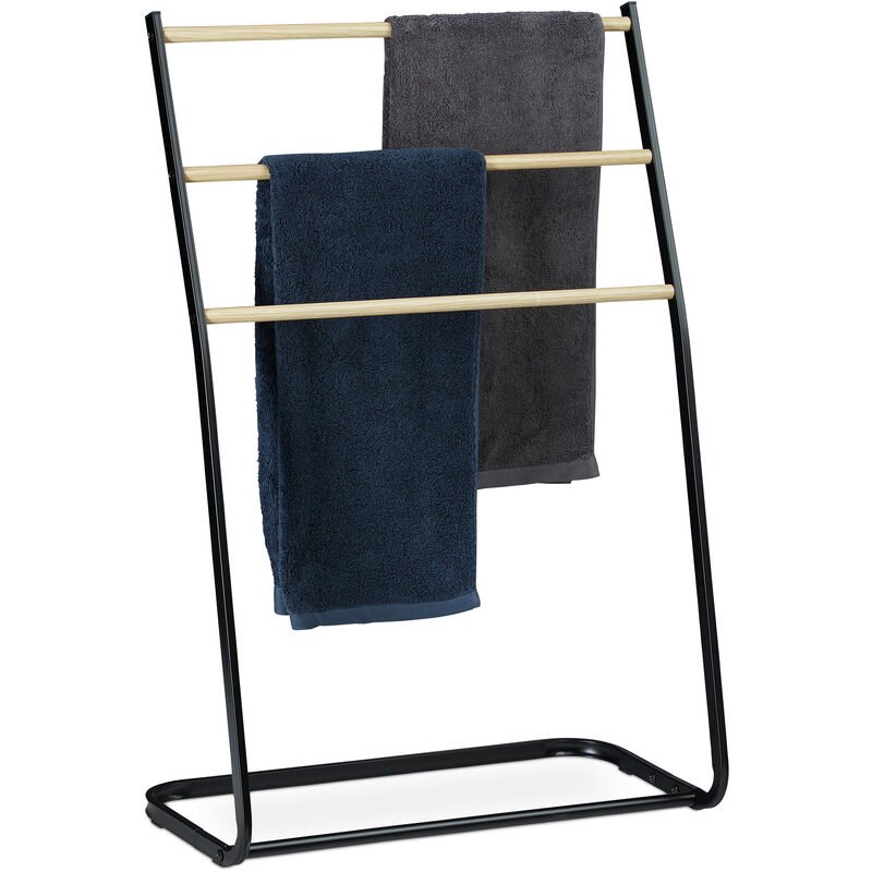 Relaxdays - Porte-serviettes sur pieds, échelle, escalier 3 barres, métal bois support serviette bain, 86x58x30 cm, noir