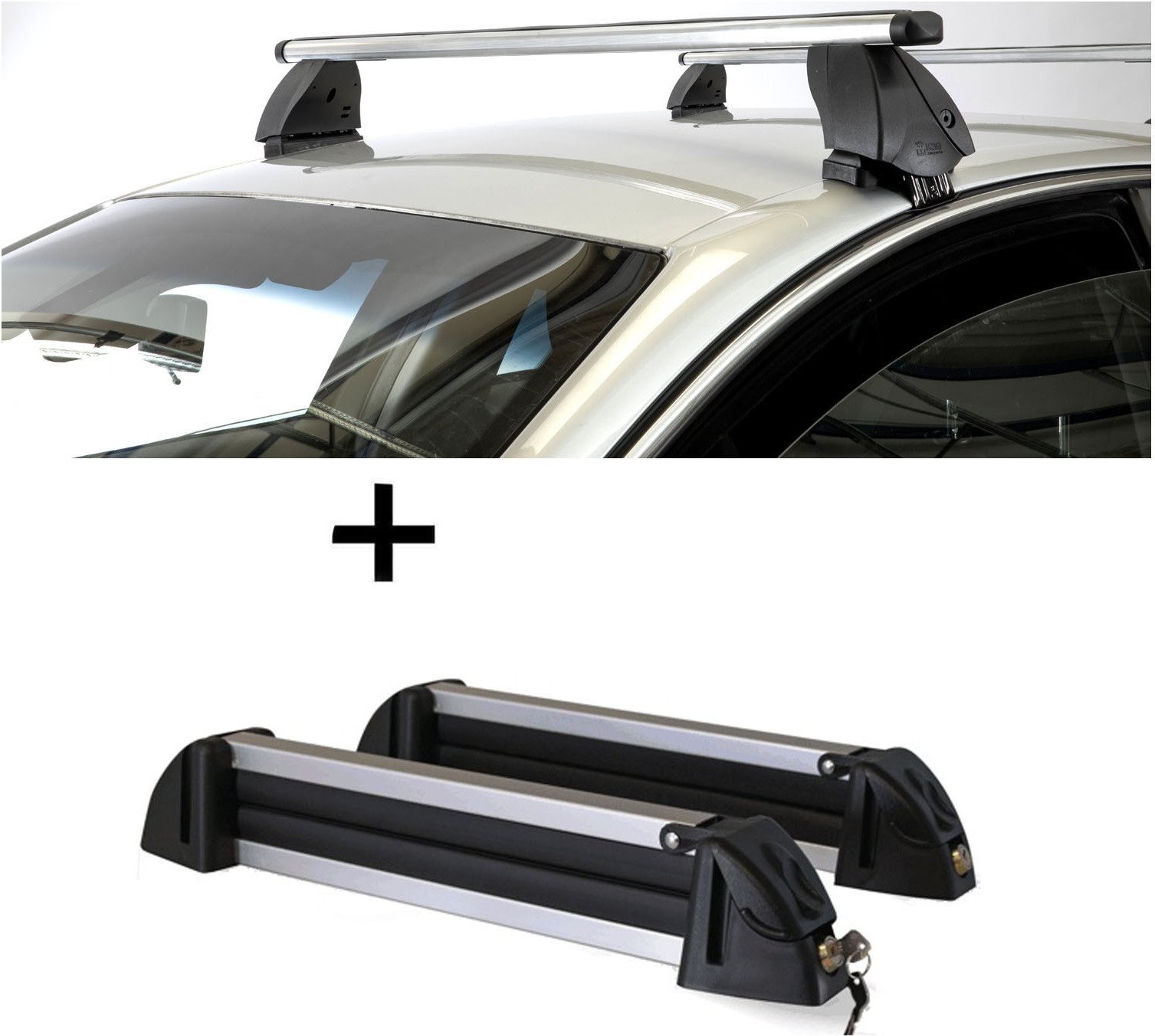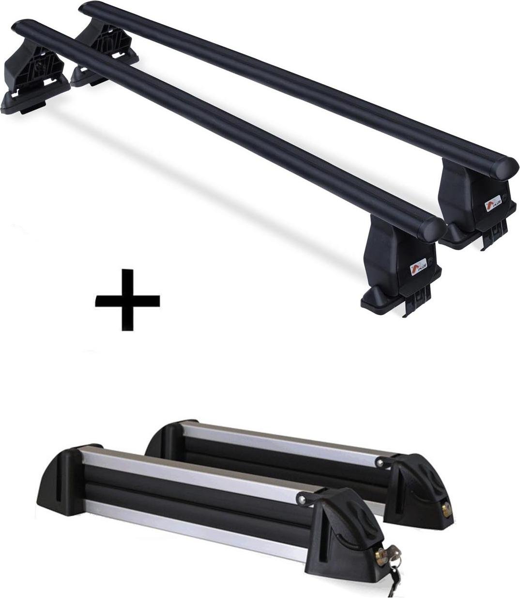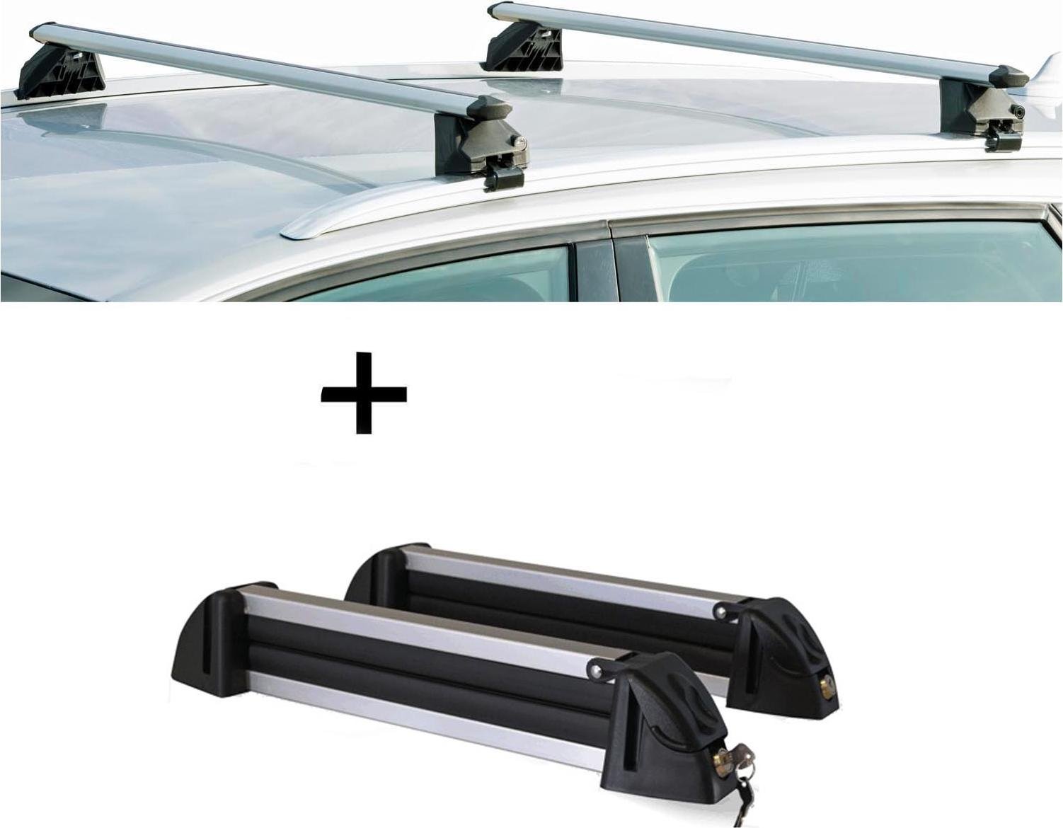 Barres de toit Menabo Tema + porte-skis / porte-planches à neige / porte-skis en aluminium 4 paires de skis compatibles avec Subaru Pleo (pour monospace 5 portes) à partir de 2007