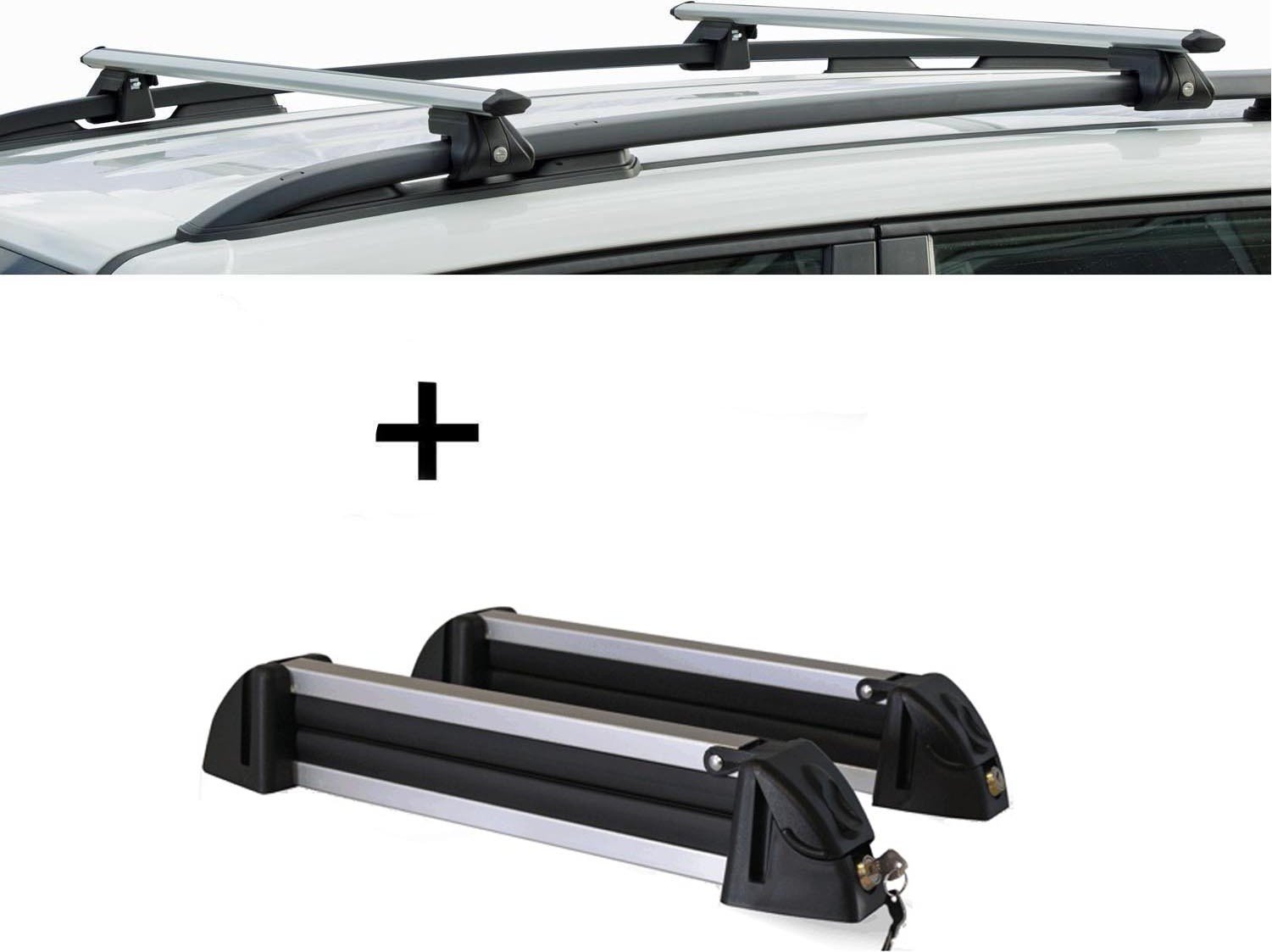 Barres de toit VDP CRV107A + porte-skis/porte-snowboards/supports de skis en aluminium pour 4 paires de skis, compatibles avec la Skoda Superb break 5 portes à partir de 2015