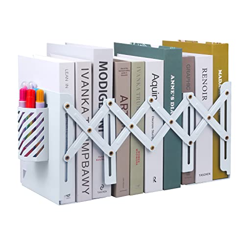 MSDADA Serre-Livres réglable Extensible en métal pour Enfants - Porte-Livres antidérapant avec Porte-Stylo Amovible pour Cuisine, Bureau, école, bibliothèque (Blanc)