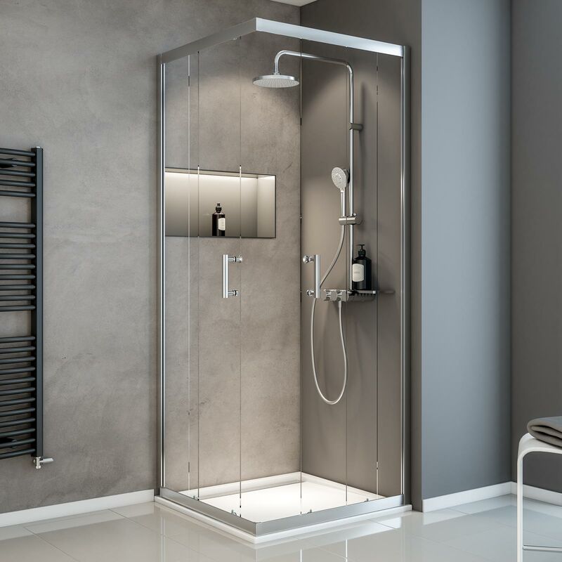 Accès d'angle arrondi avec portes de douche coulissantes, 90 x 90 x 190 cm verre transparent 5 mm, profilé aspect chromé, Sunny Schulte