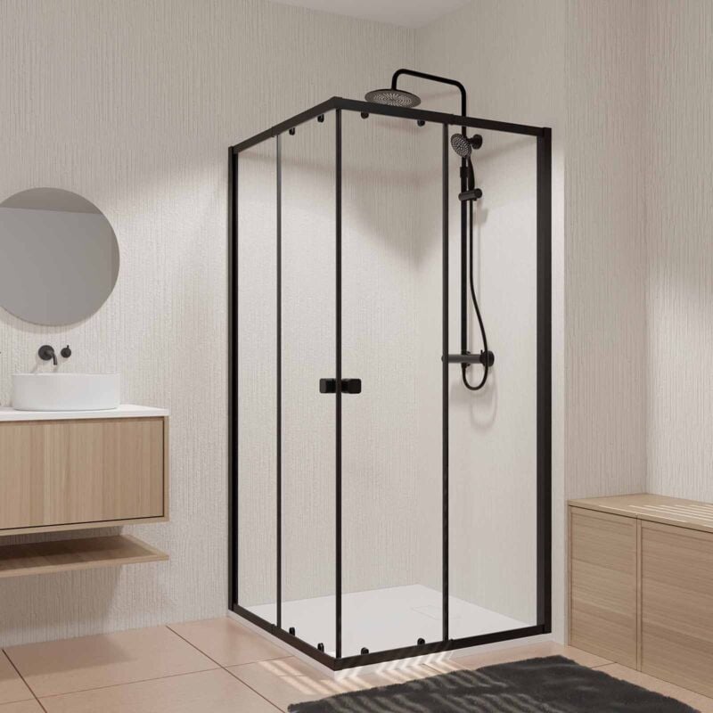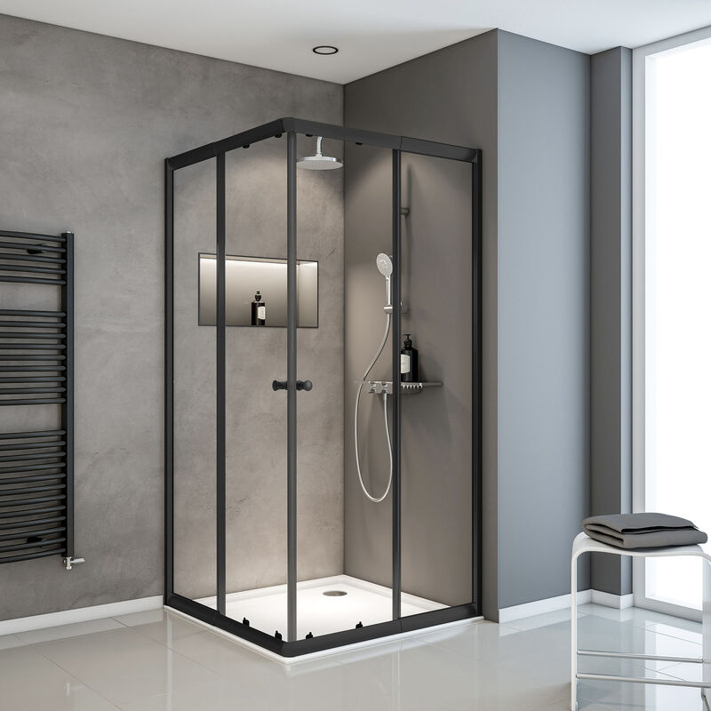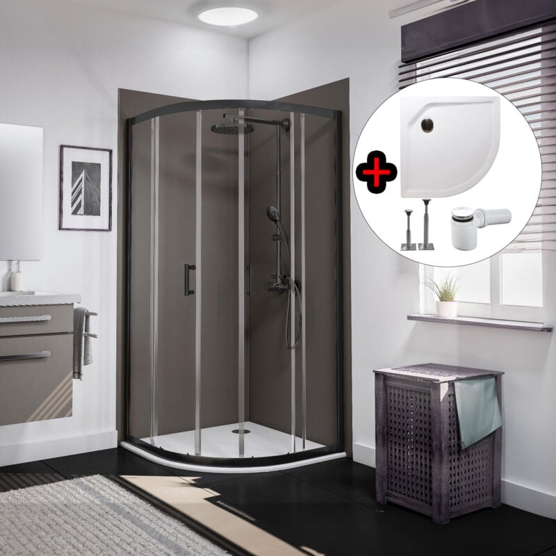 Accès d'angle arrondi 90 x 90 x 190 cm avec portes de douche coulissantes + receveur, verre 5 mm transparent anticalcaire, profilé noir, Sunny Schulte