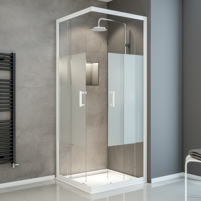 Accès d'angle droit avec portes de douche coulissantes, 5 mm, Sunny Schulte verre sablé au milieu, profilé blanc, 80 x 80 x 190 cm
