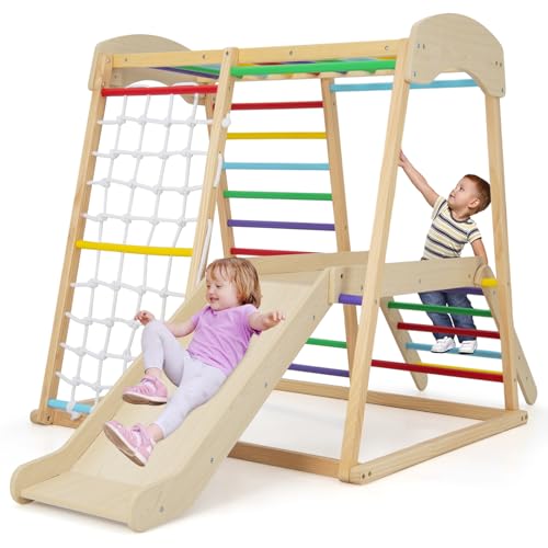 GOPLUS 6 en 1 Escalade Enfant Montessori, Aire de Jeux Structure d'escalade avec Portique, Toboggan, Corde et Échelles en Bois Ancrages, pour Enfants 1 an+, Charge 60 kg (Multicolore, 6 en 1)